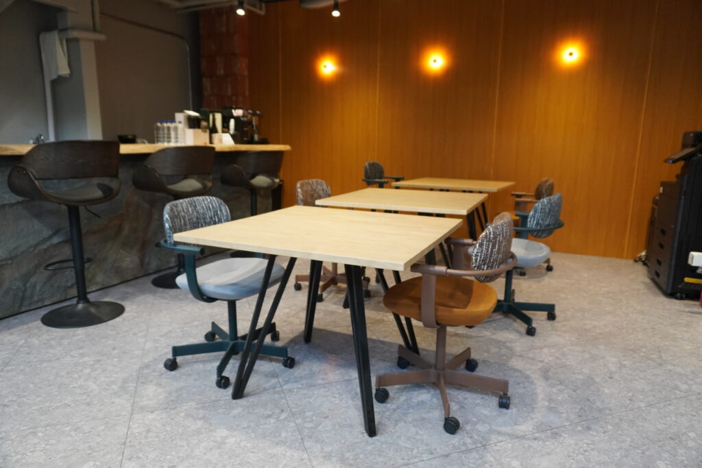 内装にも拘っており、商談や打ち合わせが捗ります。コーヒーや軽食も有料提供しており、どなたでも購入が可能ですのでお気軽にお立ち寄りください。